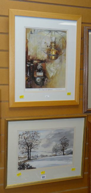 RANSOM watercolour - winter landscape, 24 x 36cms together with a DAVID WESTON artist's proof print, entitled 'Oil Lamp & Ephemera'