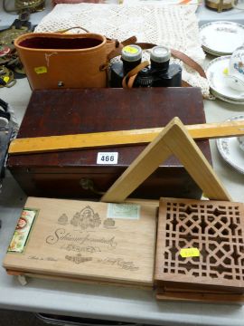 Three lidded wooden boxes, a pair of 8x40 binoculars and a vintage bed cover