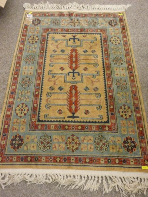 Eastern style woven carpet, multi-bordered with stylized central pattern and tasselled ends