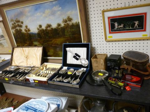 Three cased quantities of cutlery, a vintage Kodak Baby Hawkeye camera, two vintage tins etc