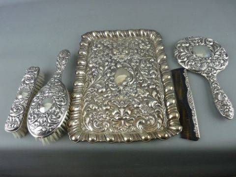 Silver embossed mask decorated dressing table tray and four piece mirror and brush set with additional comb cap cover, Birmingham hallmark 1901, (split to tray edge, holed in one or two areas)