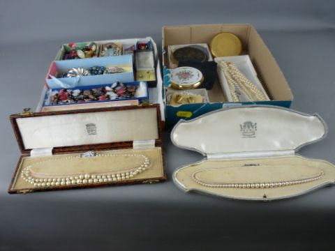 Collection of vintage costume jewellery and powder compacts with cased sets of simulated pearls