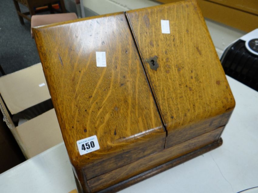A vintage oak slope front compartmented stationary cabinet