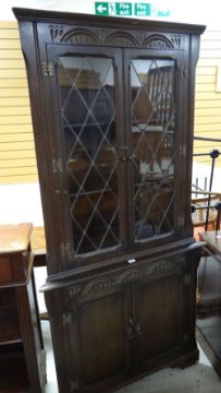 A lunette carved reproduction corner cabinet with glazed top