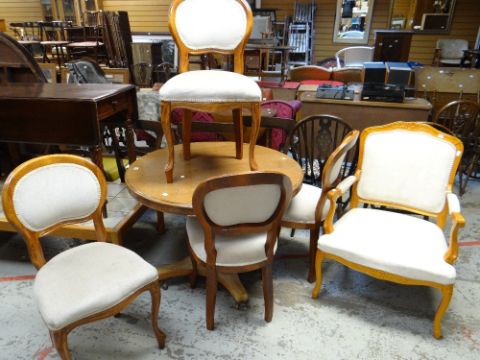 Mixed wood circular breakfast table together with set of four spoon-back dining chairs and open arm elbow chair (6)