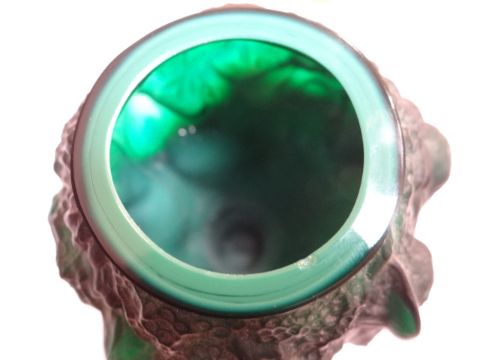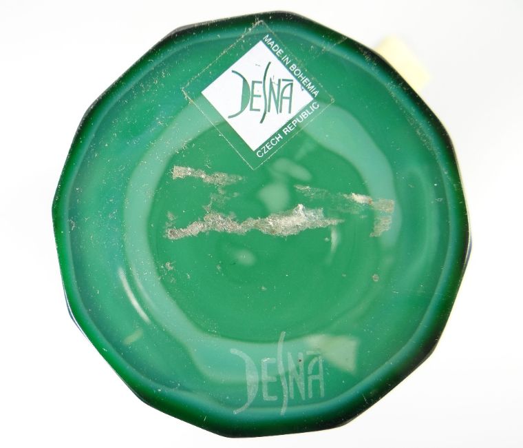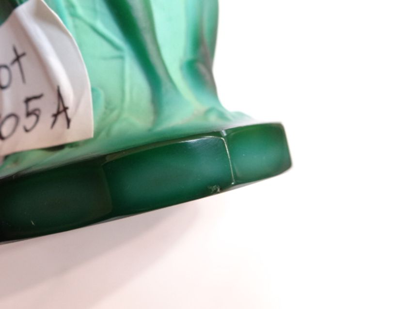A Desna Bohemian green glass jade effect figural vase Condition reports provided on request by email for this auction otherwise items purchased `as seen`There is a very small chip to the rim at the top and one to the bottom, there is no further damage.