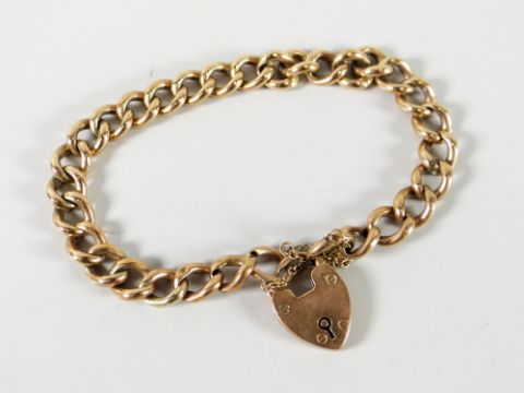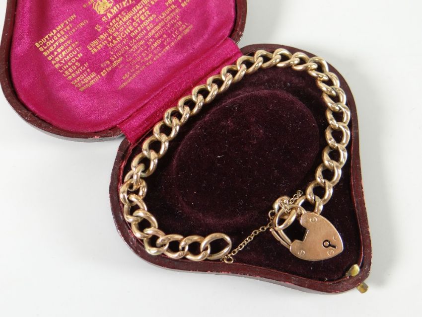 A cased 9ct yellow gold link bracelet & heart shaped padlock, 14 grams