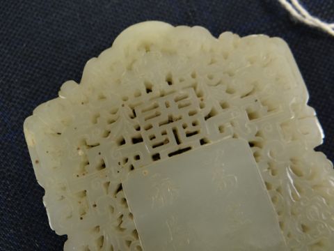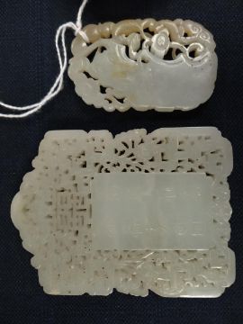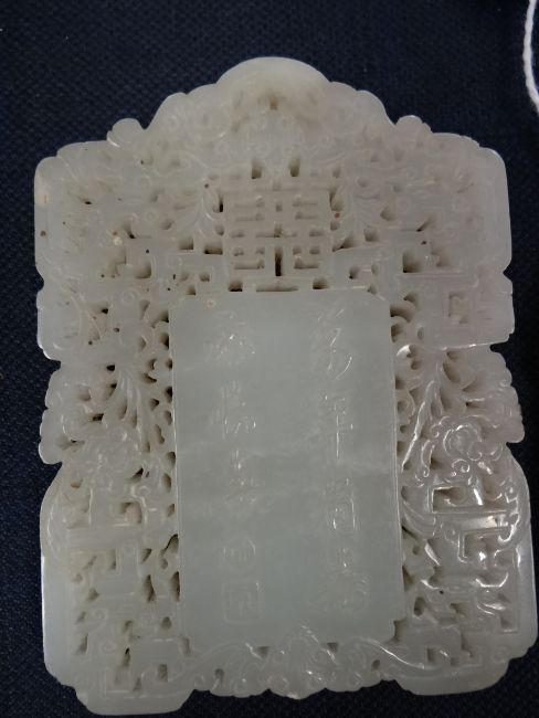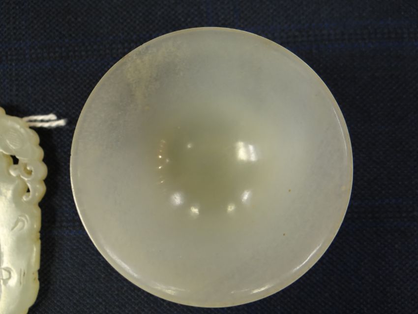 Pale jade small pedestal bowl together with carved & pierced jade panel depicting fantastic bird with character mark to reverse together with small carved jade pendant (3)