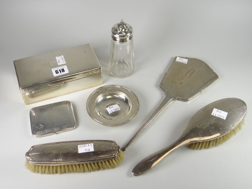 Parcel of silver comprising twin compartment rectangular cigarette box with machine turned lid, two non-matching silver backed brushes, a London 1945 silver circular dish, 3.8oz, a machine turned Art Deco-style silver backed mirror, a silver topped glass castor and a silver cigarette case with heraldic crest and fleur-de-lys patterned border