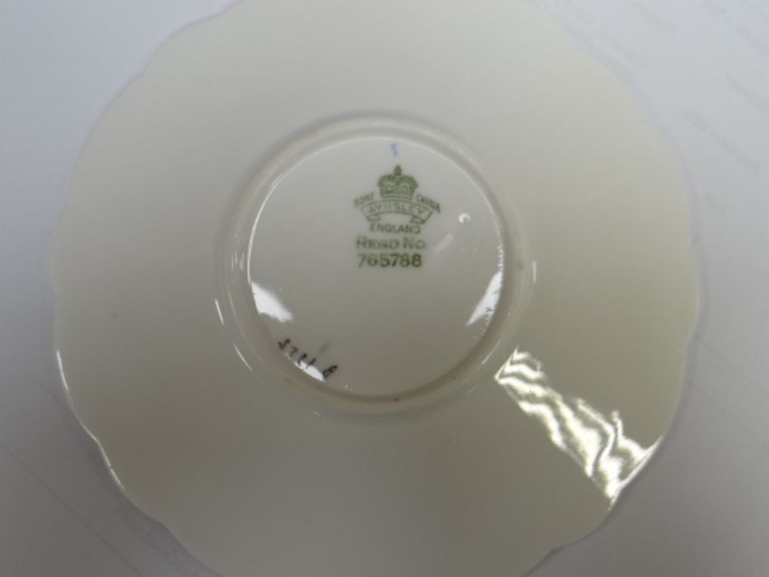 A quantity of vintage Aynsley teaware, registration number 767014 with butterfly hands Condition reports provided on request by email for this auction otherwise items purchased `as seen`There is one small chip to one of the handles of a cup, there are no other issues. I could not see any hairlines or crazing and the pieces all ring when tapped.I believe them all to be firsts, they all have the same marks.In total there are six cups, six saucers, six side plates, one cream jug and one serving plate, all good apart from that one small chip.