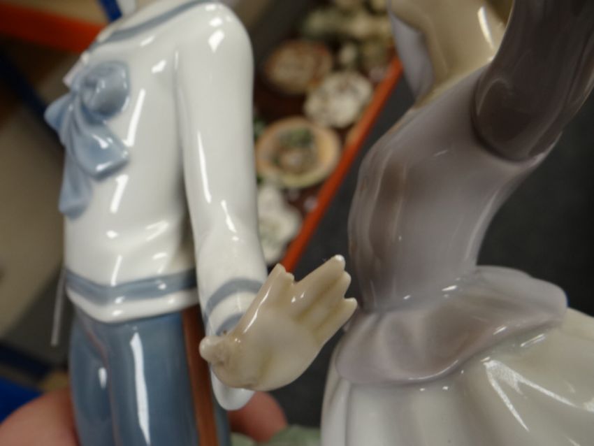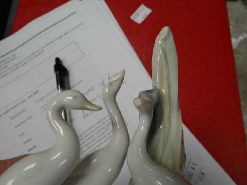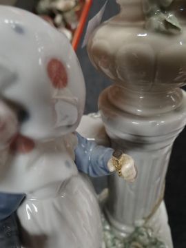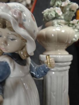 A Lladro group of children reading, a Lladro group of a boy teasing a girl with a ball, a Lladro little girl beside a flower pedestal and another girl walking a puppy ETC Condition reports provided on request by email for this auction otherwise items purchased `as seen`One of the figures has a broken finger, one of the ducklings has a broken beak and on one of the larger figures something has broken off in the girls hand, the other three figures look good, I could not see any damage.