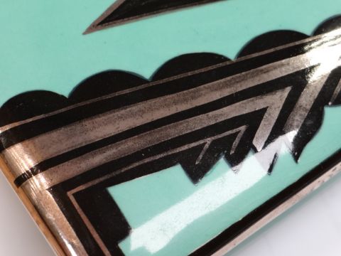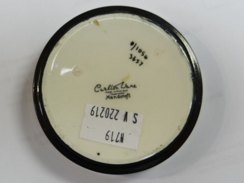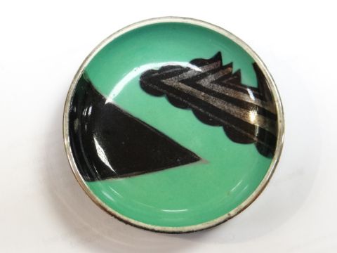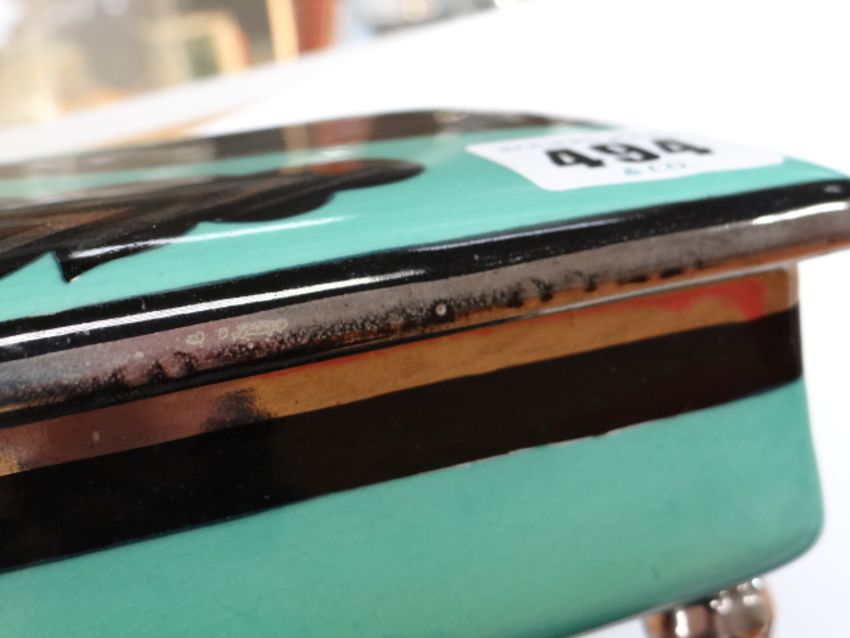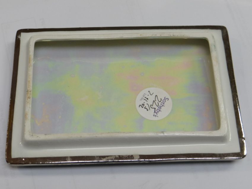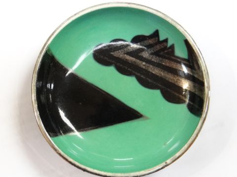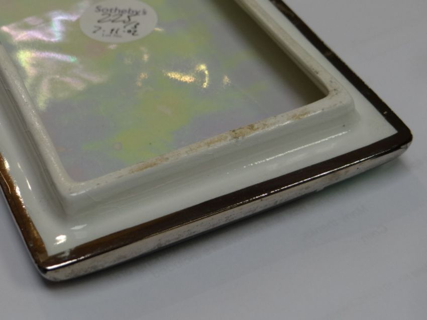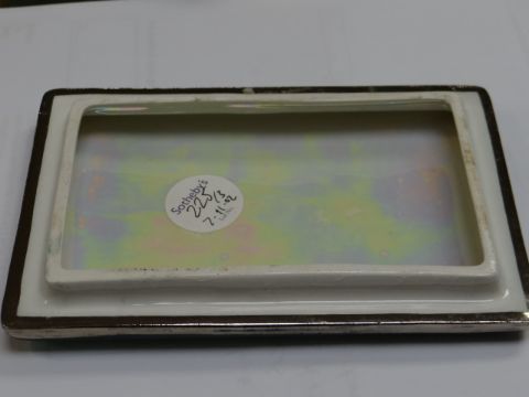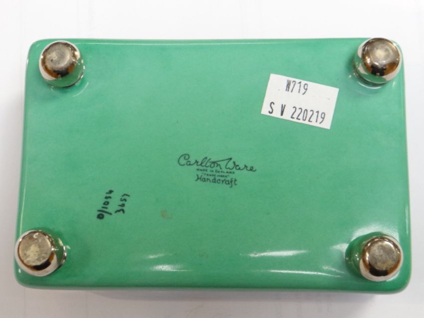A Carltonware Art Deco-style lustre dressing-table box & matching pin dish Condition reports provided on request by email for this auction otherwise items purchased `as seen`It is in nice condition, I could not see any damage or restoration.There is some wear to the silver gilt around the edges and to the pattern in the middle and there is some crazing.
