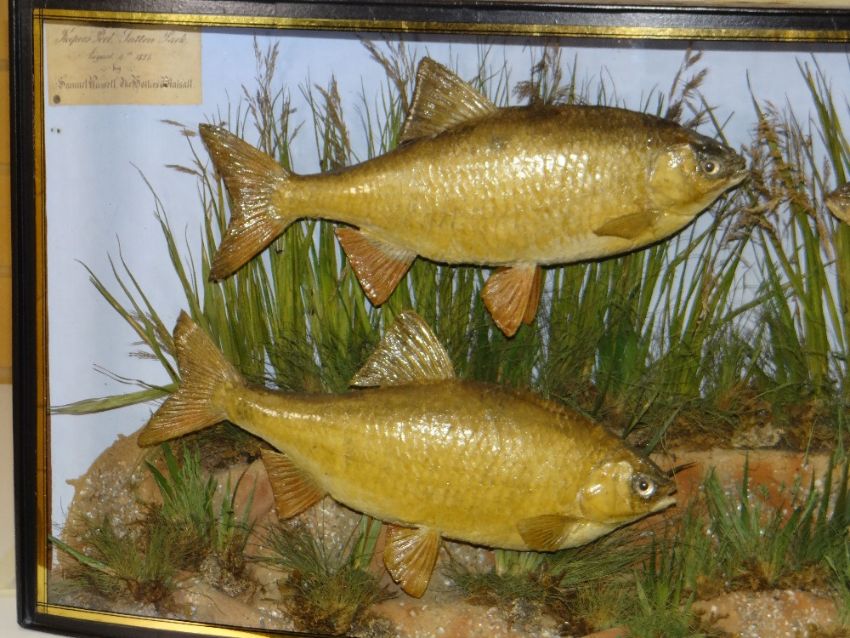 TAXIDERMY LATE NINETEENTH CENTURY BOW FRONTED CASE OF FOUR ROACH having ebonized case with gold leaf border, the roach having naturalistic background and base, label to the interior reading 'Caught in the Keeper's Pool, Sutton Park, August 4th 1886 by Samuel Russell, the hollies walsall (??)', 93.5 wide x 42 high x 18cms at deepest point