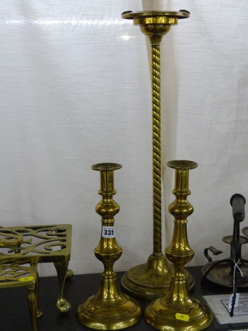 Pair of circular based tall brass candle holders and a circular based brass smoker's companion with twist column