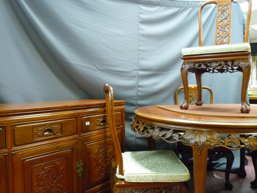 Reproduction Oriental hardwood dining suite of sideboard with carved front, 180 cms long together with eight (six plus two) dining chairs and a dining table
