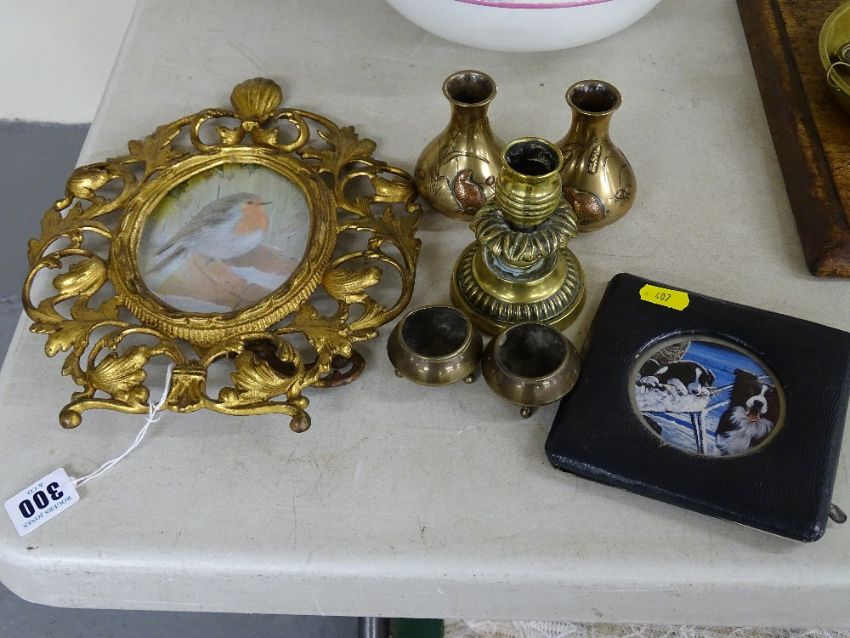 Print of a robin in an attractive gilt leaf and scrolled easel frame, a pair of small Oriental brass vases with raised bird and floral decoration, two miniature brass bowls, a brass salt and a framed picture of two sheepdogs