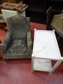 Antique upholstered easy chair and a white painted two tier tea table