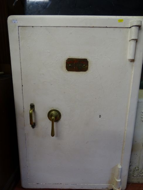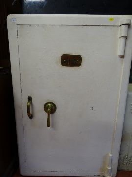 White painted floorstanding safe with plaque 'Withey Grove Stores Safe Factors, Office Furnishers, Leeds & Manchester' with key