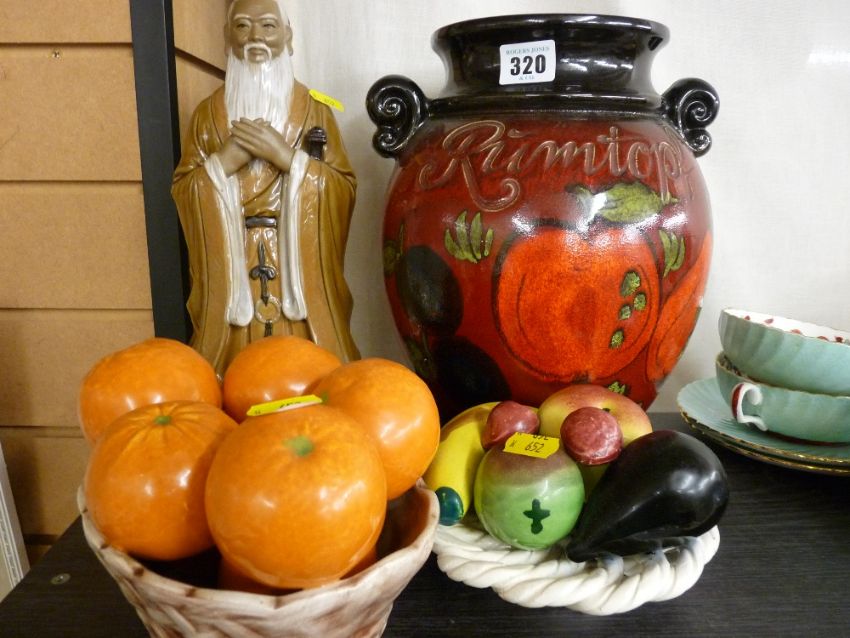 Oriental figure, faux fruit basket ornament and a Rumtopf jar