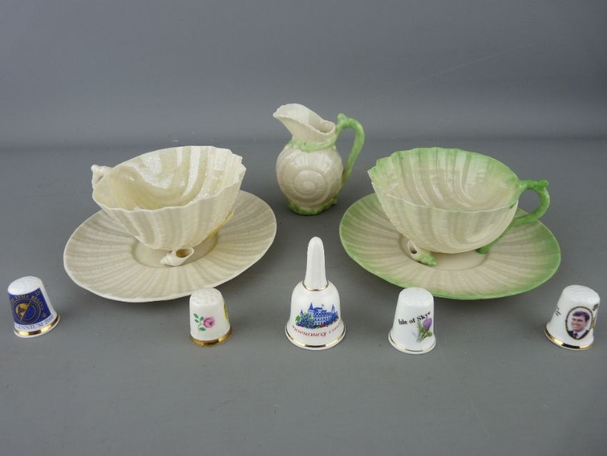 Two Belleek china cabinet cups and saucers and a small jug etc