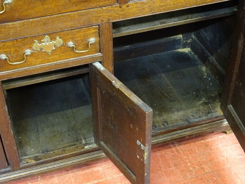 A GEORGE III RARE & FRESH TO THE MARKET SNOWDONIA OAK DRESSER, the canopied rack with decorative apron and wide back boards, twin shelves over incorporated cupboard doors and central drop down panel with interior spice drawers, initialled 'M H' and dated 1775 with inlay to the flanking panels, over a panel sided base section of peg-joined construction and an arrangement of four drawers and three shaped and chamfered panel cupboard doors, on corner bracket feet, good colour and virtually untouched condition (drawer handles replaced, two 5 cms let-ins to the top, slight areas of wear and tear and staining to the top)Height 188cms, width 159cms, depth 57cms