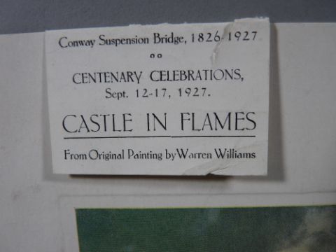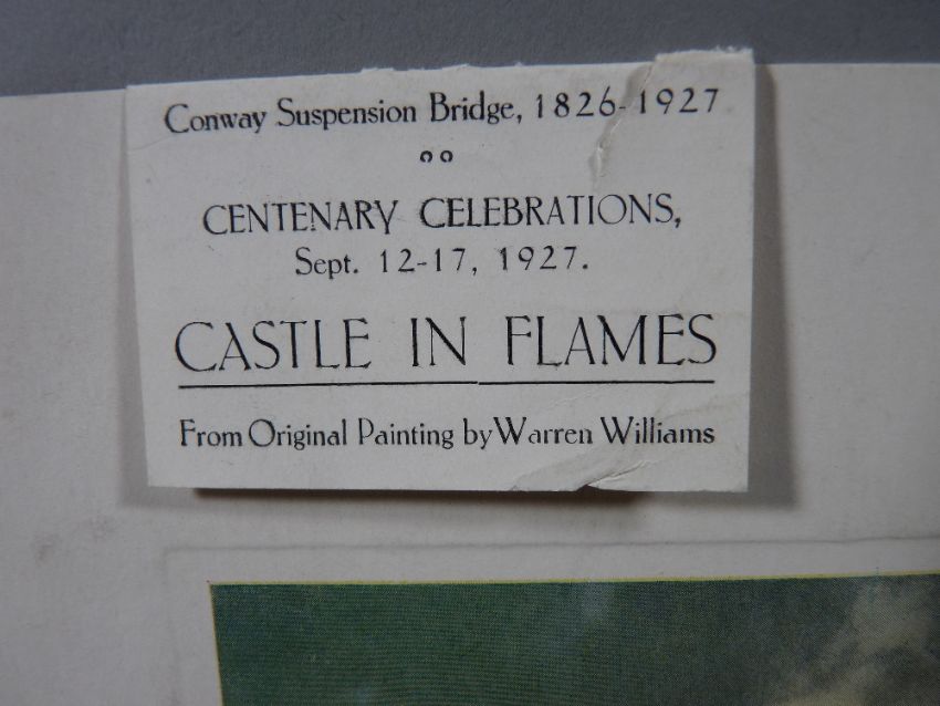 POSTCARDS - a small parcel of postcards relating to Conwy and coastal views in and around Llandudno, a postcard of Oakwood Park Hotel, Conwy together with a Christmas & New Year greetings booklet from Oakwood Park and a very large parcel of postcards of Warren Williams' original painting of the Conwy Suspension Bridge and Castle seemingly on fire in the Centenary Celebrations, September 12th 1927