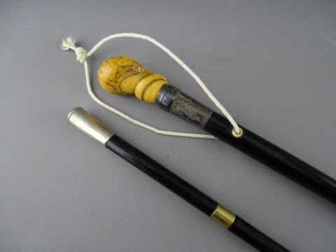TWO EBONIZED CANES including a swagger stick type with Royal Army Medical Corps white metal top, the other with sterling silver collar and carved ivory head in the style of Mr Punch, 93 cms and 92 cms long respectively