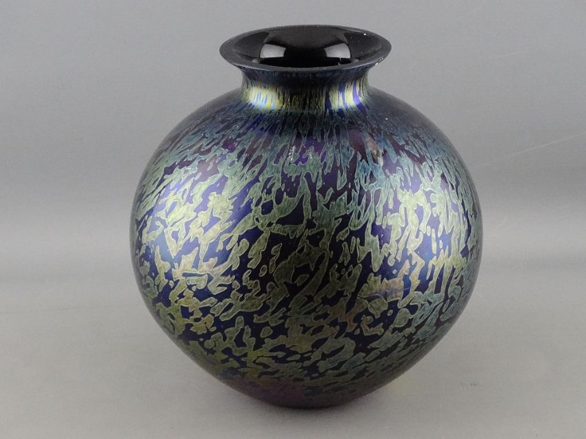 A PAIR OF CONTEMPORARY IRIDESCENT ART GLASS BULBOUS VASES, the bases marked 'Royal Brierley Studio', 20 cms high
