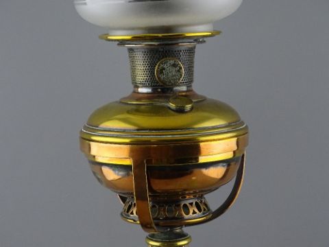 A VICTORIAN BRASS OIL LAMP with Aladdin model 12 burner on a column stem with circular pot base and decorative glass shade, 65 cms high overall
