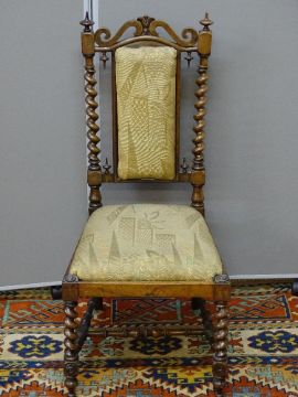 A VICTORIAN CHILD'S ROSEWOOD SIDE CHAIR with pierced crest and turned finials, block and twist side and front supports with turned and block stretchers, upholstered drop-in seat pad and back panel, 84 cms high, 38 cms wide, 34 cms seat depth