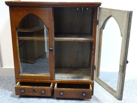 A 19th CENTURY PINE TABLETOP CABINET having twin glazed doors with arched top detail and a pair of lower frieze drawers with turned ebonized knobs, 72.5 cms high, 67 cms wide, 31 cms maximum overall depth