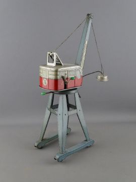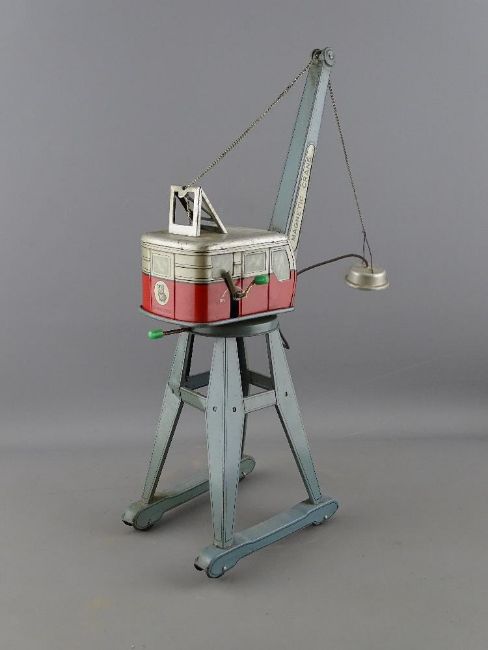 THREE TINPLATE TOY CRANES including two Western Germany clockwork examples and a Bandai Toys manual wind magnetic crane (varying states of play worn condition)