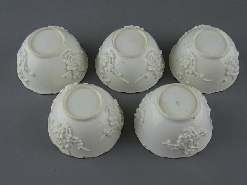 BOW PORCELAIN BLANC DE CHINE CIRCA 1750 GROUP OF FIVE TEA BOWLS & FOUR SAUCERS, all with scalloped rims and applied blossoming prunus sprays, 7 cms diameters the bowls, 11 cms diameters the saucers (one tea bowl cracked, one chipped and stained, one saucer with tiny chip, one chipped with three small hairlines, one with repaired break and one small hairline)