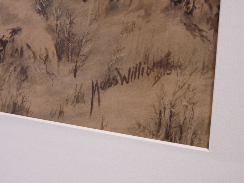 MOSS WILLIAMS watercolour - snowy landscape scene with figure and two horses and dog on a track, signed and dated 1915, 35 x 50 cms