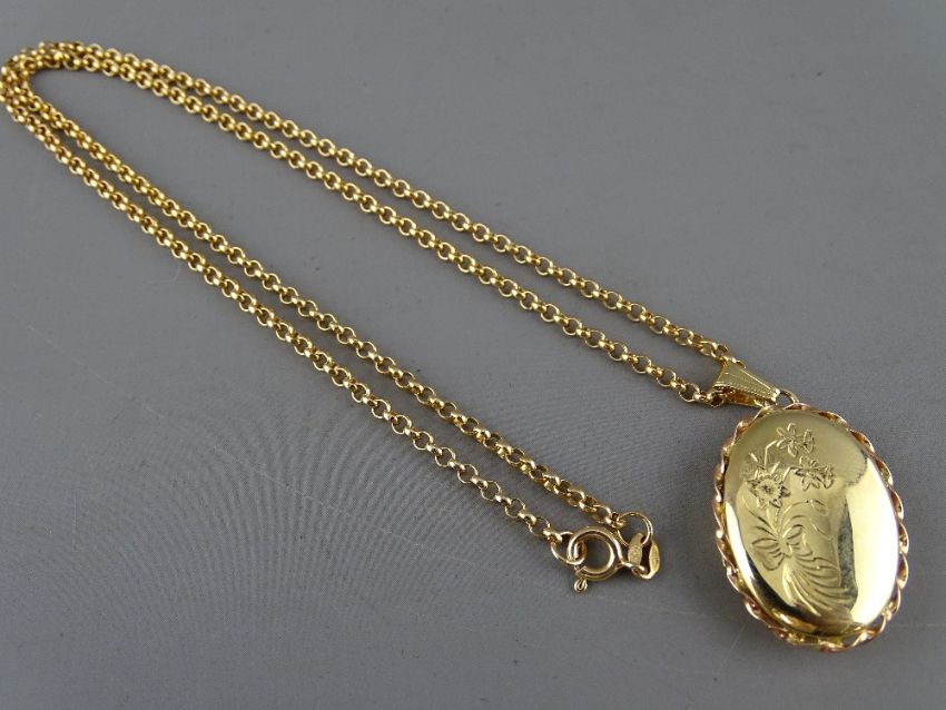 A NINE CARAT GOLD FLORAL CHASED LOCKET & NECKLACE, 12.6 grms gross