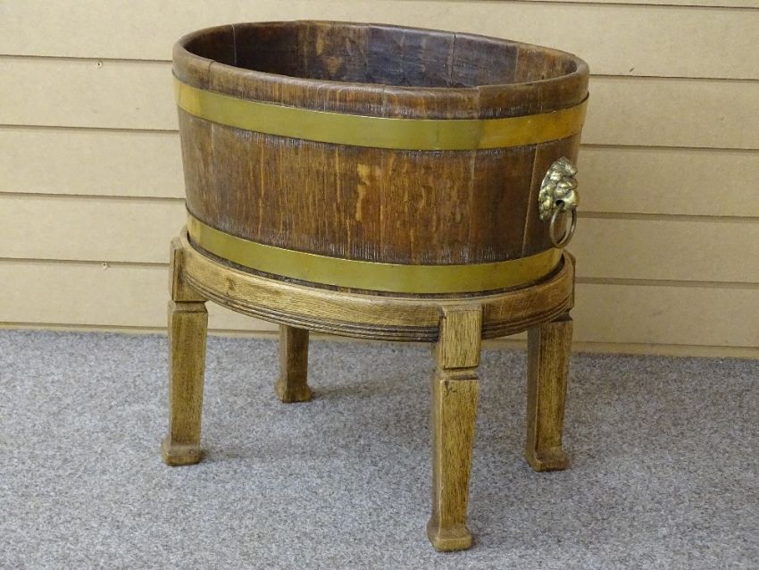 AN EARLY 20th CENTURY BRASS BOUND OAK WINE COOLER on stand with lion mask carry handles, 51 cms high overall, 51 cms wide (no liner)