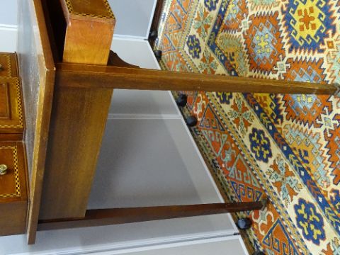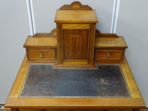 AN EDWARDIAN INLAID MAHOGANY LADY'S WRITING DESK, central top single door cupboard with pigeonhole interior and flanking drawers, tooled leather insert above a single frieze drawer on slender supports and brown pot castors, the whole with Sheraton fans, line and boxwood with ebony inlays, 111 cms high overall, 71.5 cms wide, 53 cms deep