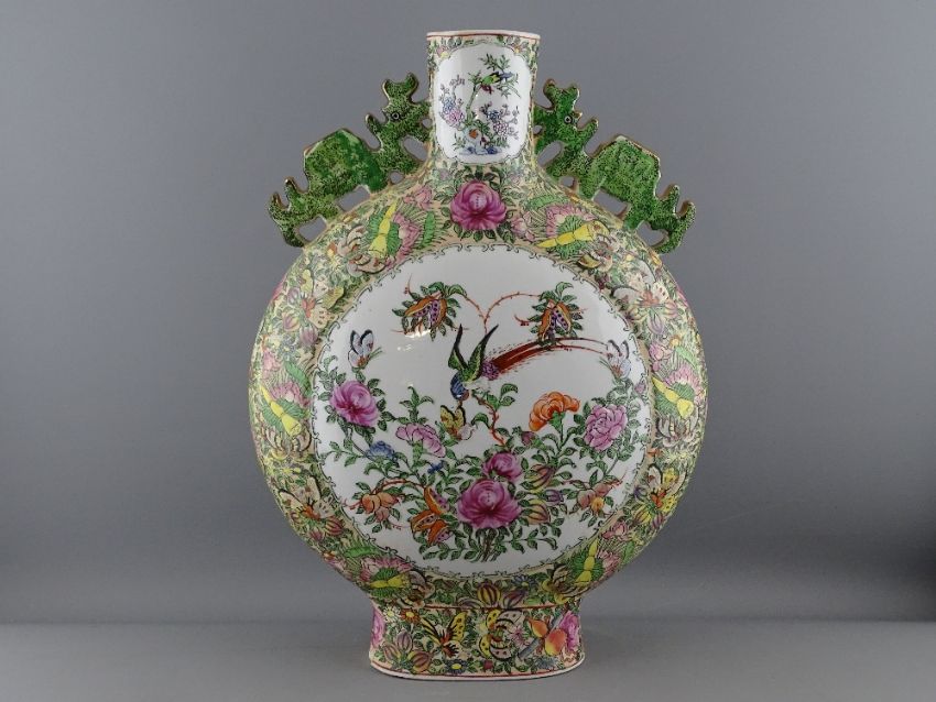 A LATE 19th CENTURY CHINESE CERAMIC MOON FLASK, Famille Rose decorated in continuous bands of butterflies amongst flowers surrounding central cartouches of birds and butterflies amongst flowers, the handles in the form of stylized beasts, the base with six character mark painted in iron red, 45 cms high (20mm chip to foot rim)