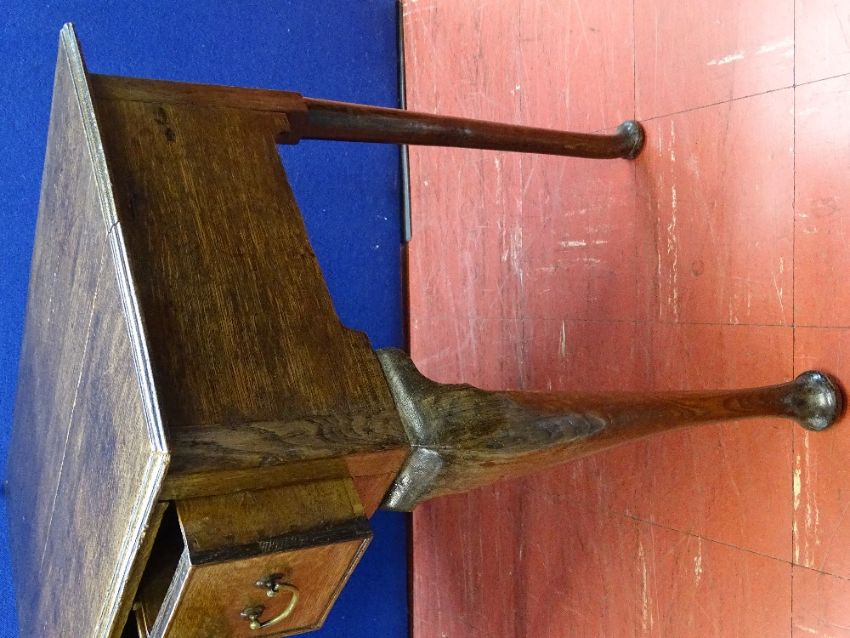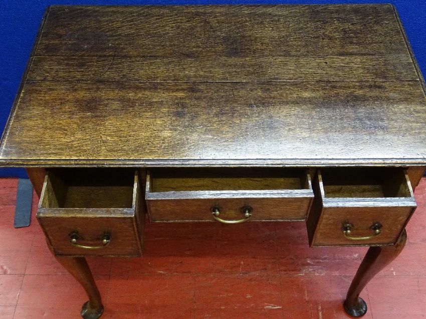 AN 18th CENTURY OAK THREE DRAWER LOWBOY on cabriole supports and pad feet, 69 cms high, 83 cms wide, 48.5 cms deep