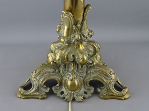A CIRCA 1900 BRASS TABLE LAMP and tasselled shade, the capped circular column with pierced Rococo style base, 51.5 cms high including electric fitting