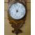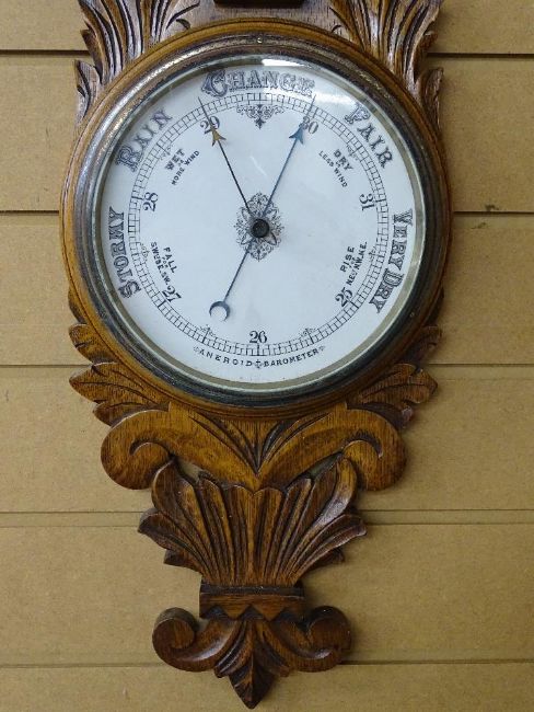 A VINTAGE ANEROID BAROMETER with ceramic dial and thermometer, set on a carved oak mount, 92 cms long