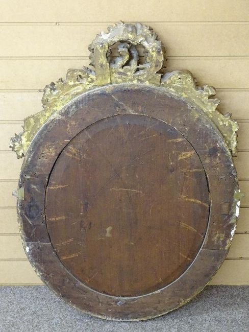 A GILT DECORATED OVAL WALL MIRROR, the bevelled edged plate surrounded by egg and dart moulding to the frame, surmounted with gesso ribbon and floral swag, 94 cms high overall, 66 cms wide