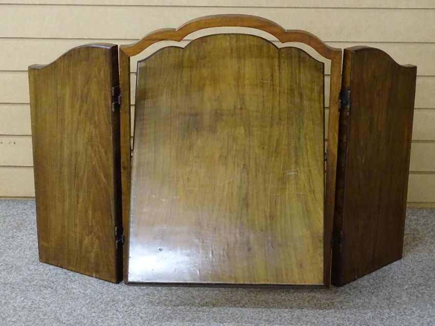 A QUALITY WALNUT FRAMED TRIPLE DRESSING MIRROR with shaped top detail, 71.5 cms maximum height, 53 cms wide closed