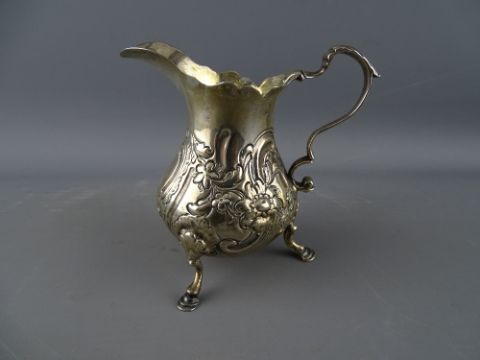 A GEORGE III SILVER CREAM JUG with floral embossed body and scroll handle on three hoof feet, London 1761, 2.5 troy ozs