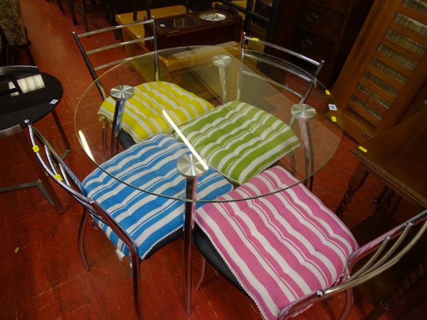 Chrome and glass circular table with four matching chrome chairs