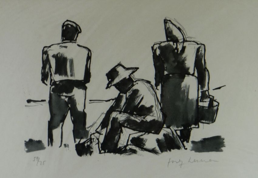 JOSEF HERMAN limited edition (59/75) monochrome print - entitled verso on Albany Gallery label 'Three Workers in the Field', signed, 25 x 34cms