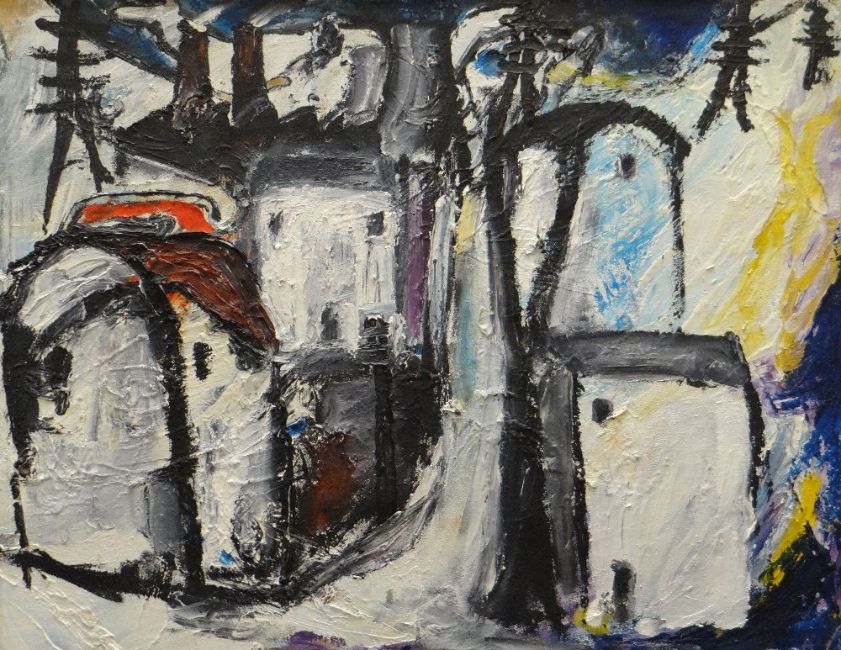 IWAN BALA oil on board - village with hill and pylons, entitled verso 'In Storm Walking', signed, 46 x 59cms (framed and unglazed)