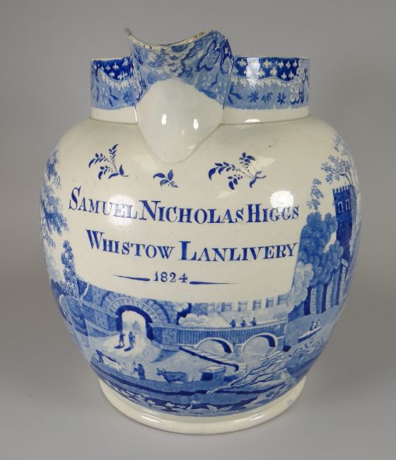 A CAMBRIAN POTTERY BLUE & WHITE TRANSFER JUG IN THE 'CASTLE GATEHOUSE' PATTERN and with additional dedication to Samuel Nicholas Higgs, Wistow, Lanlivery, dated 1824, 26cms high