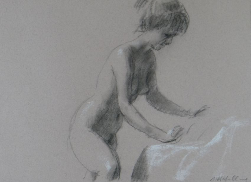 HARRY HOLLAND pencil drawing and chalk - study of a nude female leaning, signed, 25 x 32cms (framed and glazed)