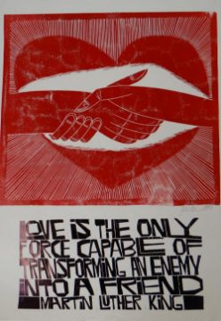 PAUL PETER PIECH two-colour lithograph - heart and handshake image with quote from Martin Luther King 'Love is the only force capable of transforming an enemy to a friend', signed and dated 1990, 64 x 45cms (unframed)